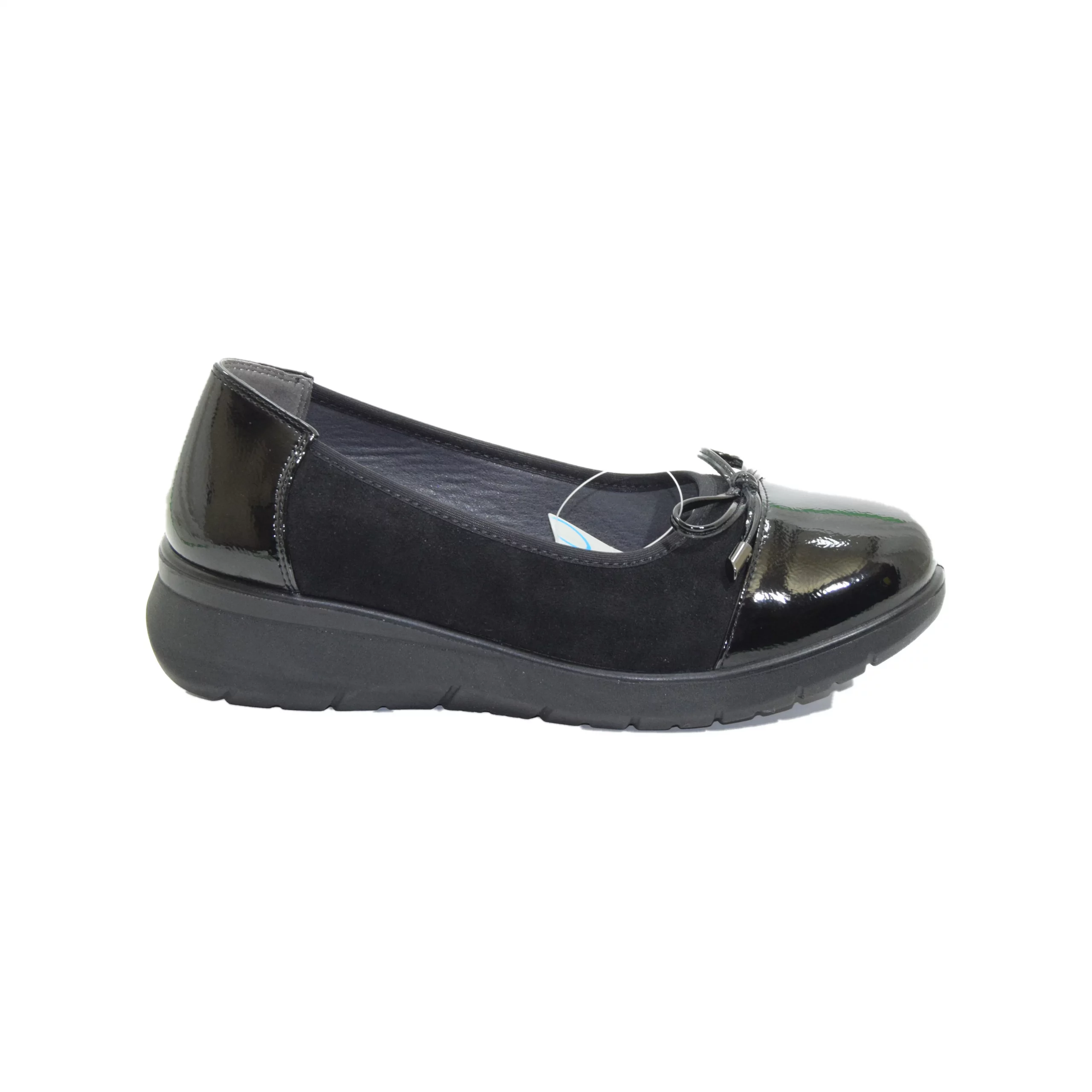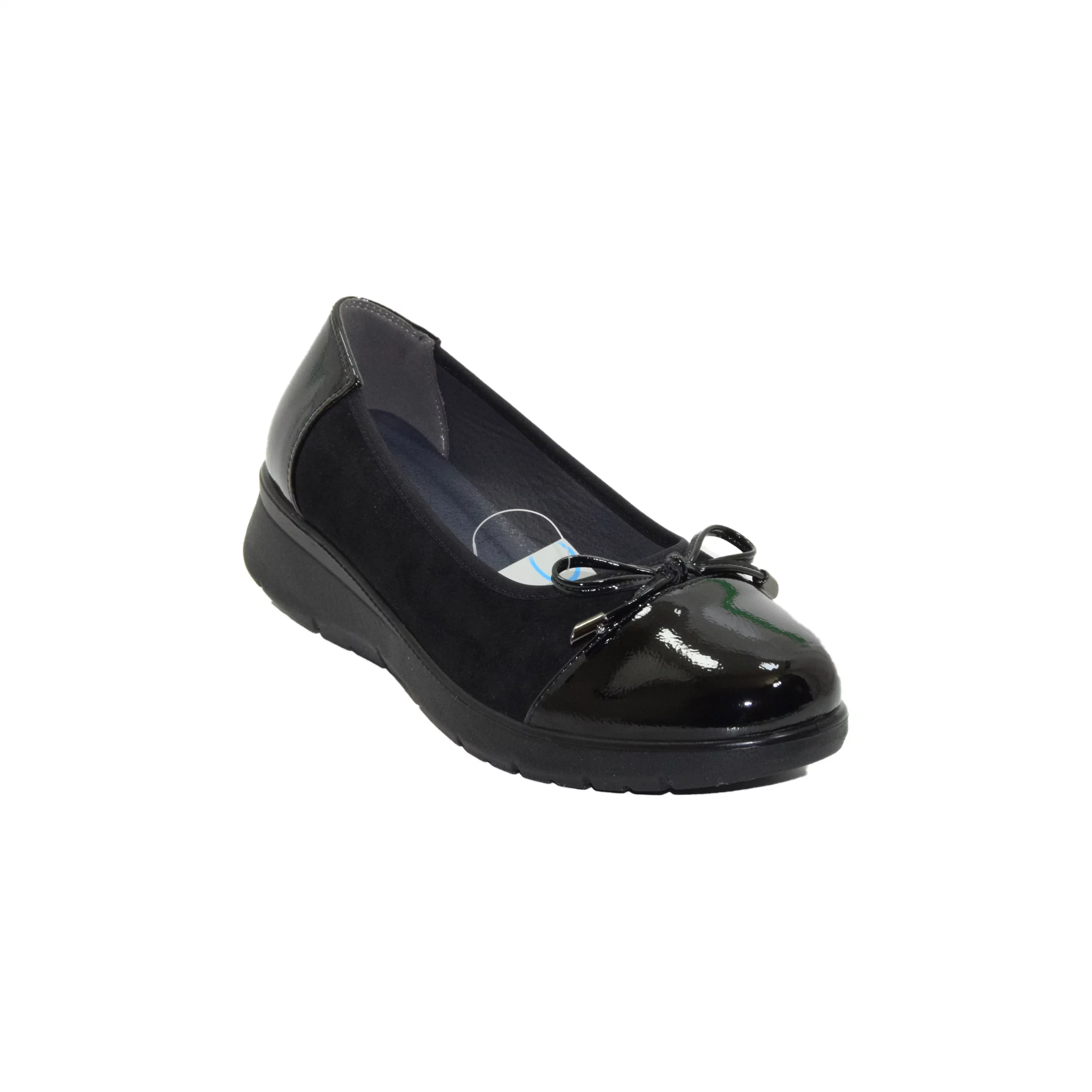 Ballerina comoda donna con zeppa cm.4. Tomaia in ecovernice in colore nero, marca CO.MFORT. Quest’articolo è un ottimo cavallo di battaglia, vista la comodità e durata. Il fondo è in gomma leggero antiscivolo e flessibile, per una ottima postura.