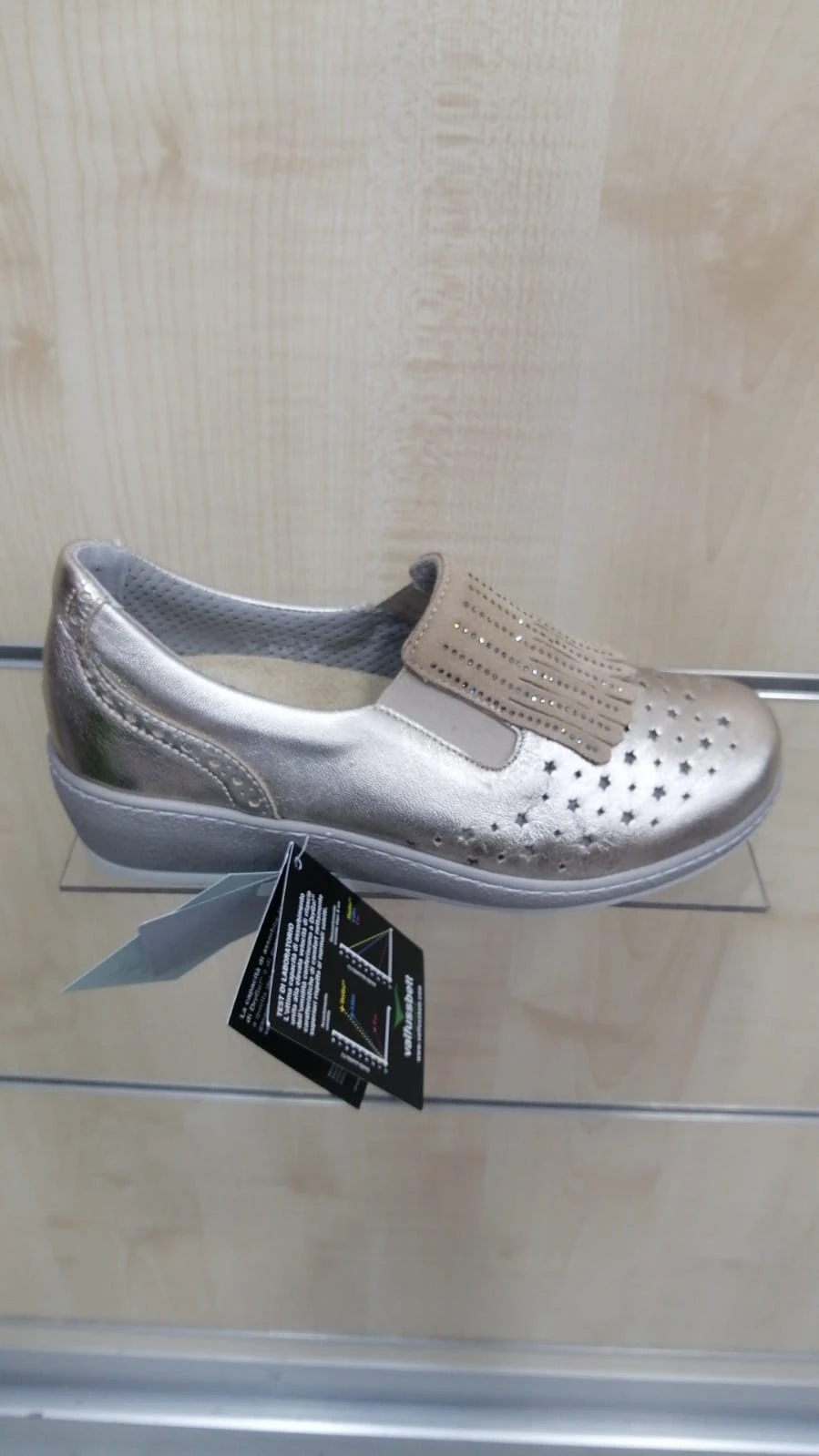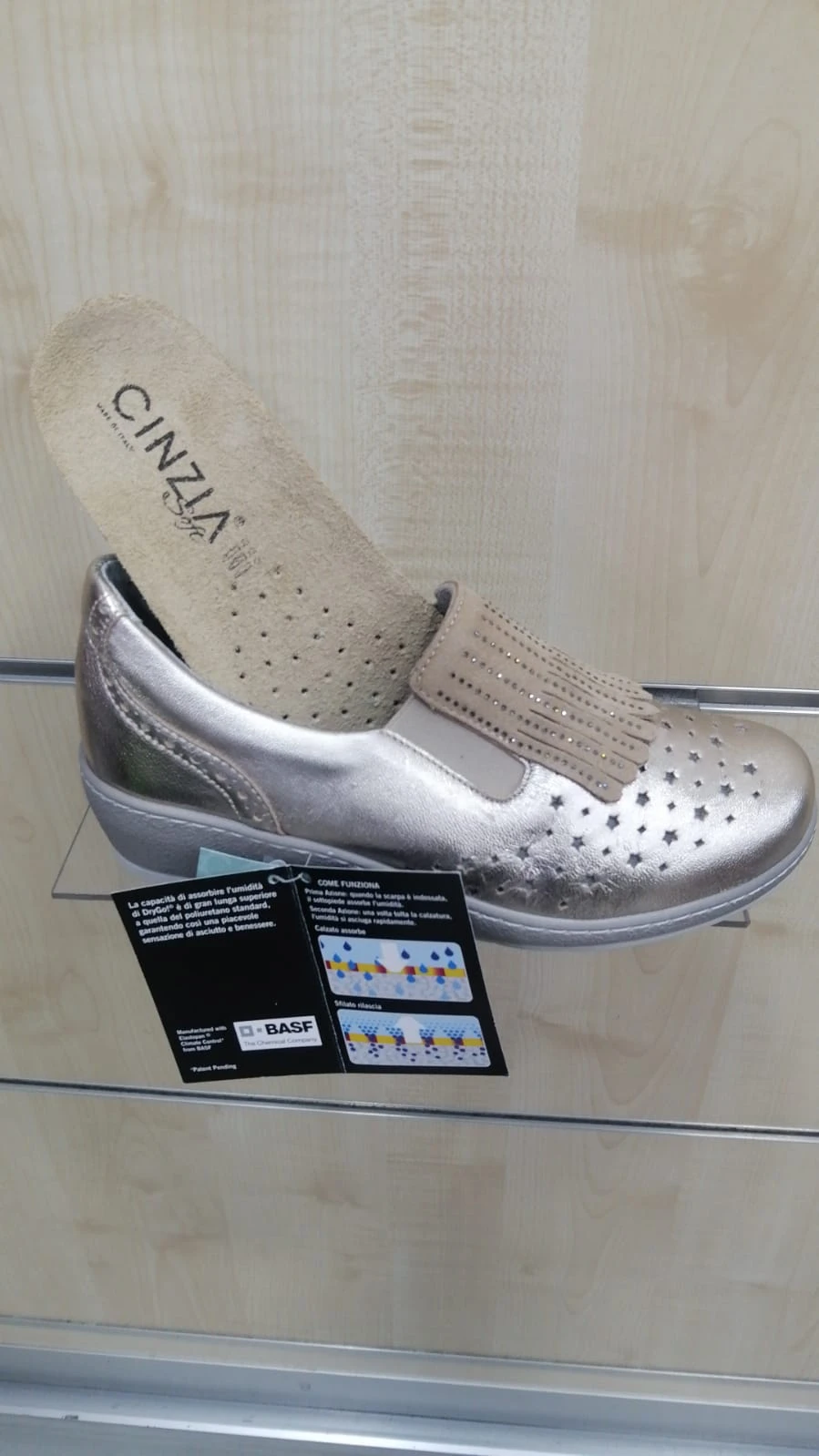Cinzia Soft plantare estraibile a pianta larga. Tomaia adatta all’alluce valgo e/o dito a martello con frangetta in pelle fiore colore platino. Scarpa mocassino con elastico nascosto Cinzia Soft, fondo in gomma con zeppa cm.5. Plantare in pelle estraibile. Forma generosa per piedi generosi.