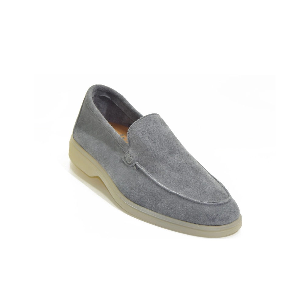Mocassino camoscio uomo marca Varese Collection. Prodotto interamente Italiano con una tomaia in camoscio morbido grigio chiaro, fondo in gomma flessibile e antiscivolo ottima calzabilità anche a piedi più generosi.