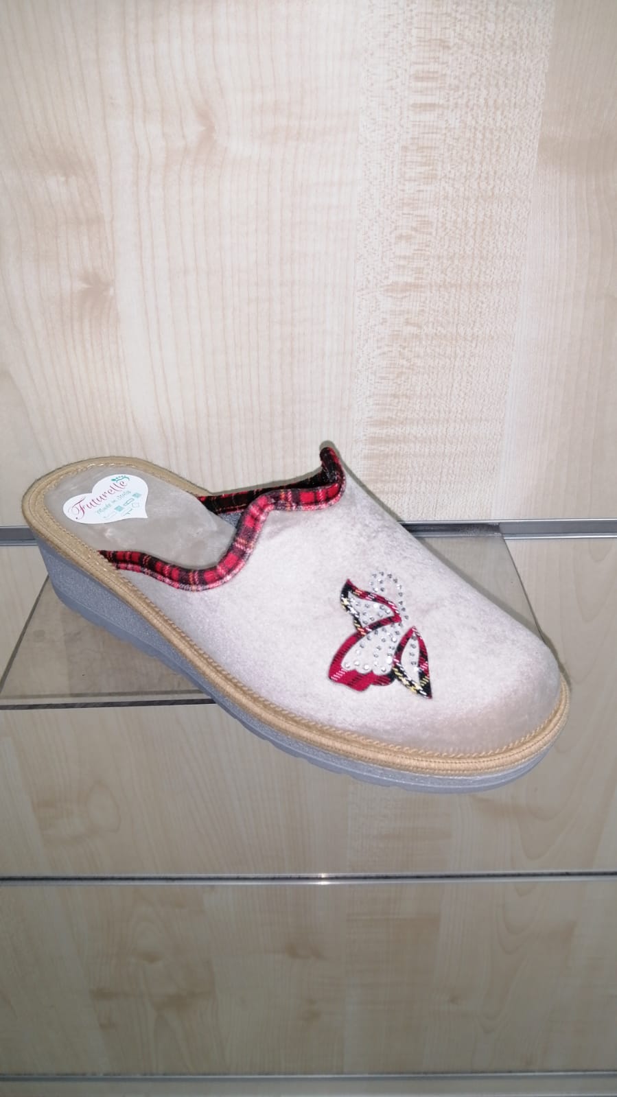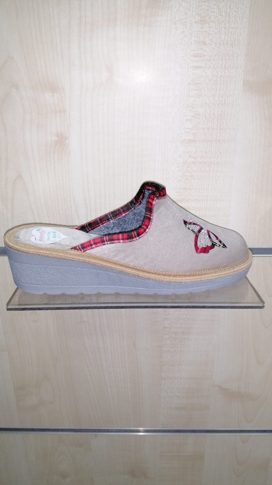 Pantofola a zeppa alta cm.4 e platò cm.1,5 marca Futurelle. Tomaia chiusa avanti in stoffa in colore beige medio, sottopiede in stoffa traspirante e profumata. Fondo in gomma leggera e antiscivolo.