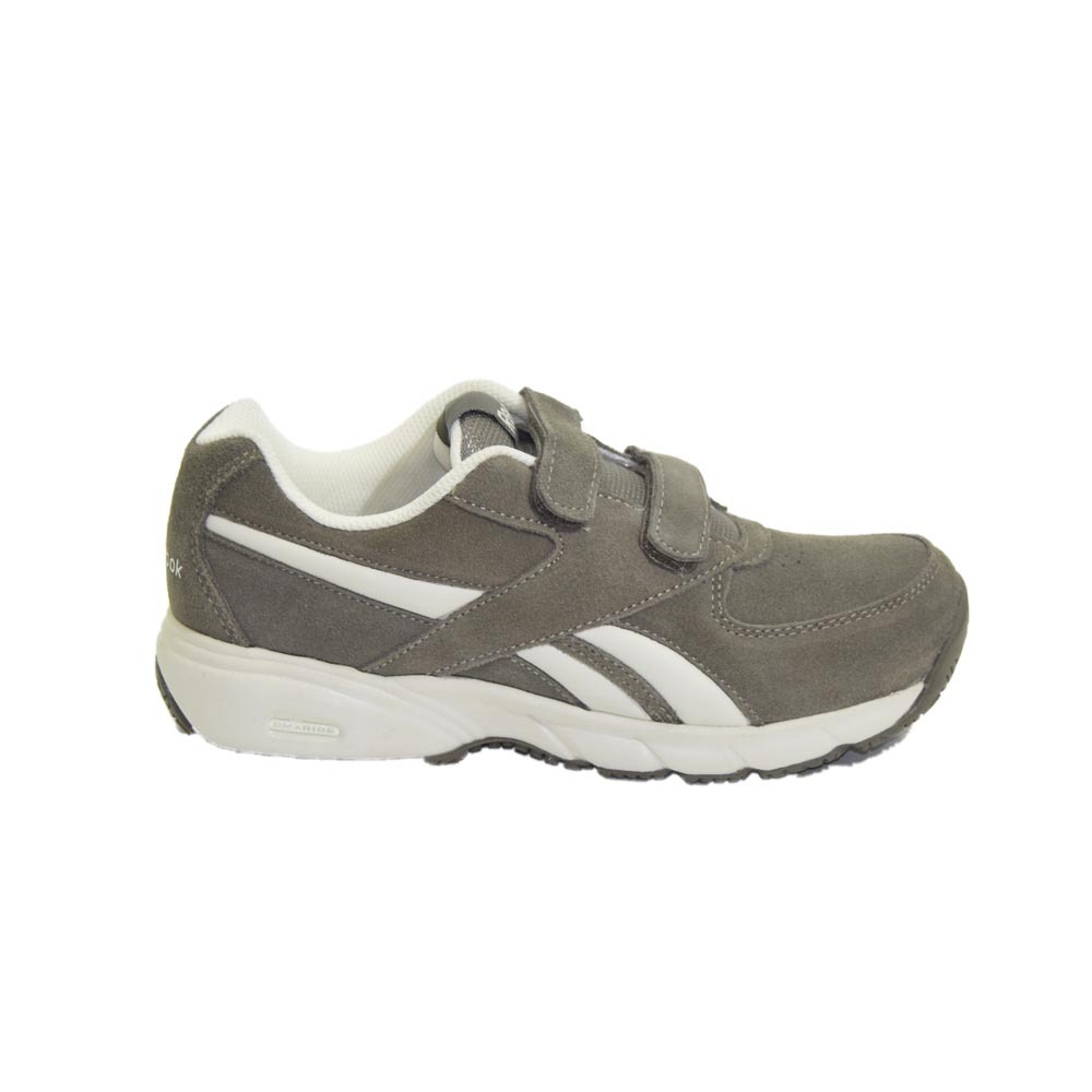 Reebok scarpe ginnastica. Ginnastica con strappo e grande possibilità di calzata comoda anche a piedi generosi sul collo piede. Tomaia in camoscio grigio/verde con innesti in bianco traspirante. Fondo in gomma antiscivolo e leggera.