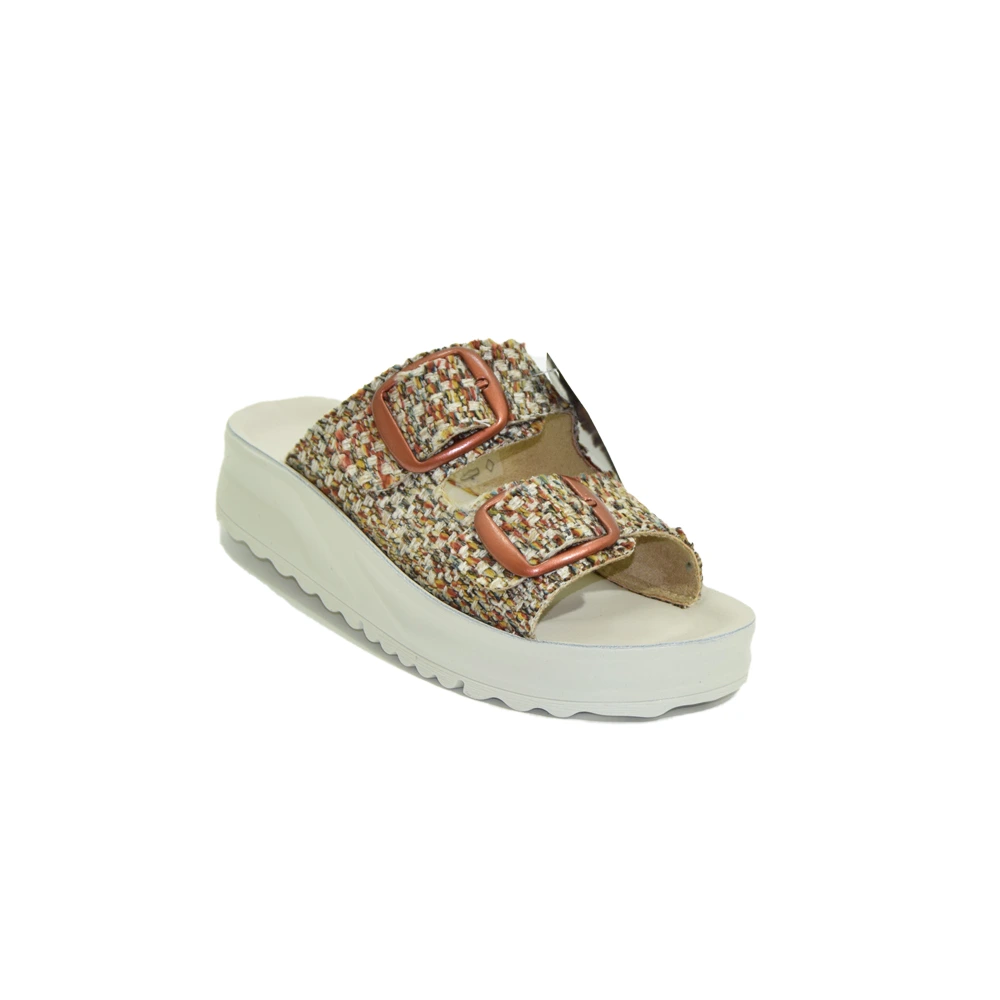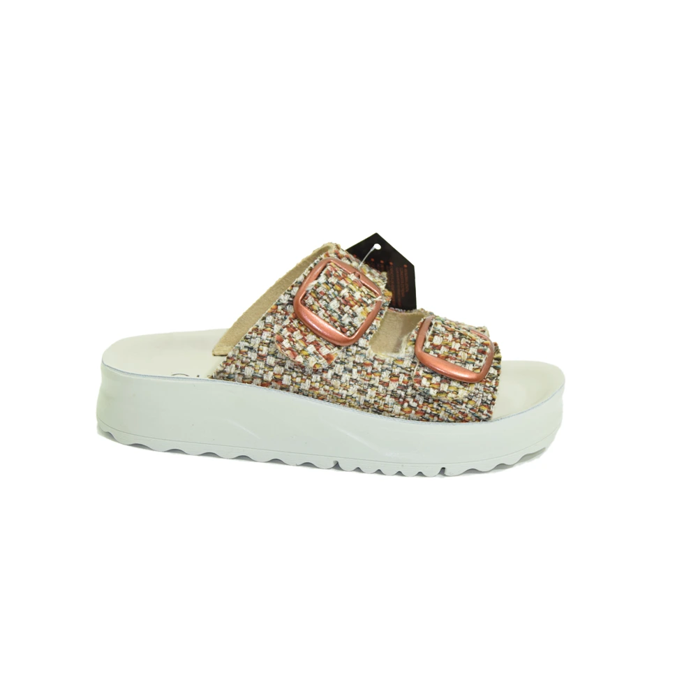 Sandalo senza fibbia con zeppa da strada Cinzia soft con gomma poliuretano antiscivolo e leggera. Tomaia composta da due fasce regolabili da adattare a qualsiasi piede e qualsiasi conformazione, disponibili in colore sacco e multicolore. Sottopiede in pelle traspirante estraibile e gomma flessibile.