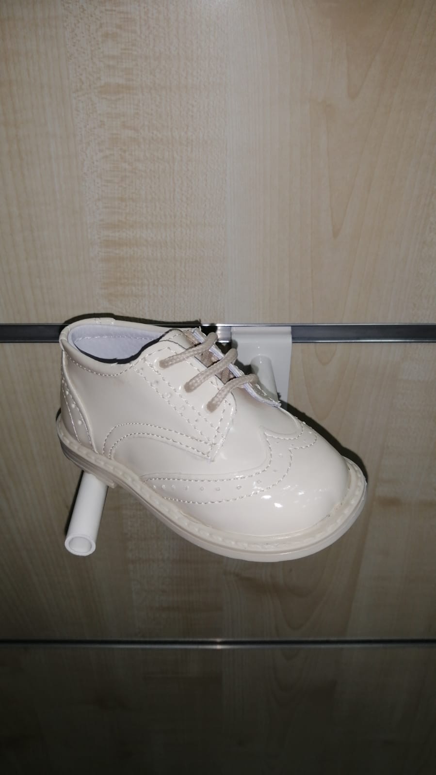 Scarpe bimbo panna, eleganti marca Kids modello francesina. La tomaia è in vernice panna/beige e la fodera interna è interamente in pelle, il fondo è in gomma sottile flessibile e antiscivolo. Questo modello soddisfa ogni esigenza, dalla sportività all’eleganza. Il colore è neutro adattabile a qualsiasi abbigliamento anche battesimale per bambino o per altri eventi che necessitano di una scarpa elegante e comoda. Disponibile in abbinamento anche la cintura in pelle panna.