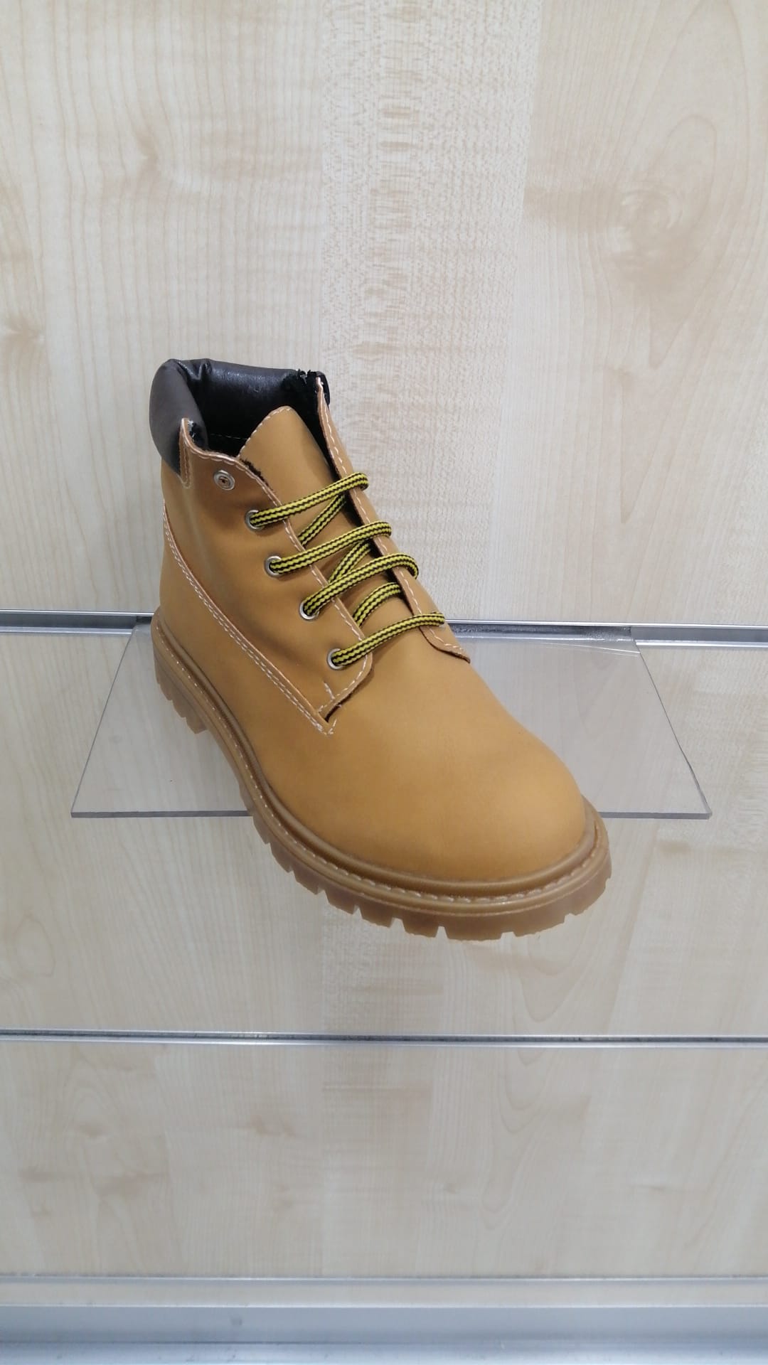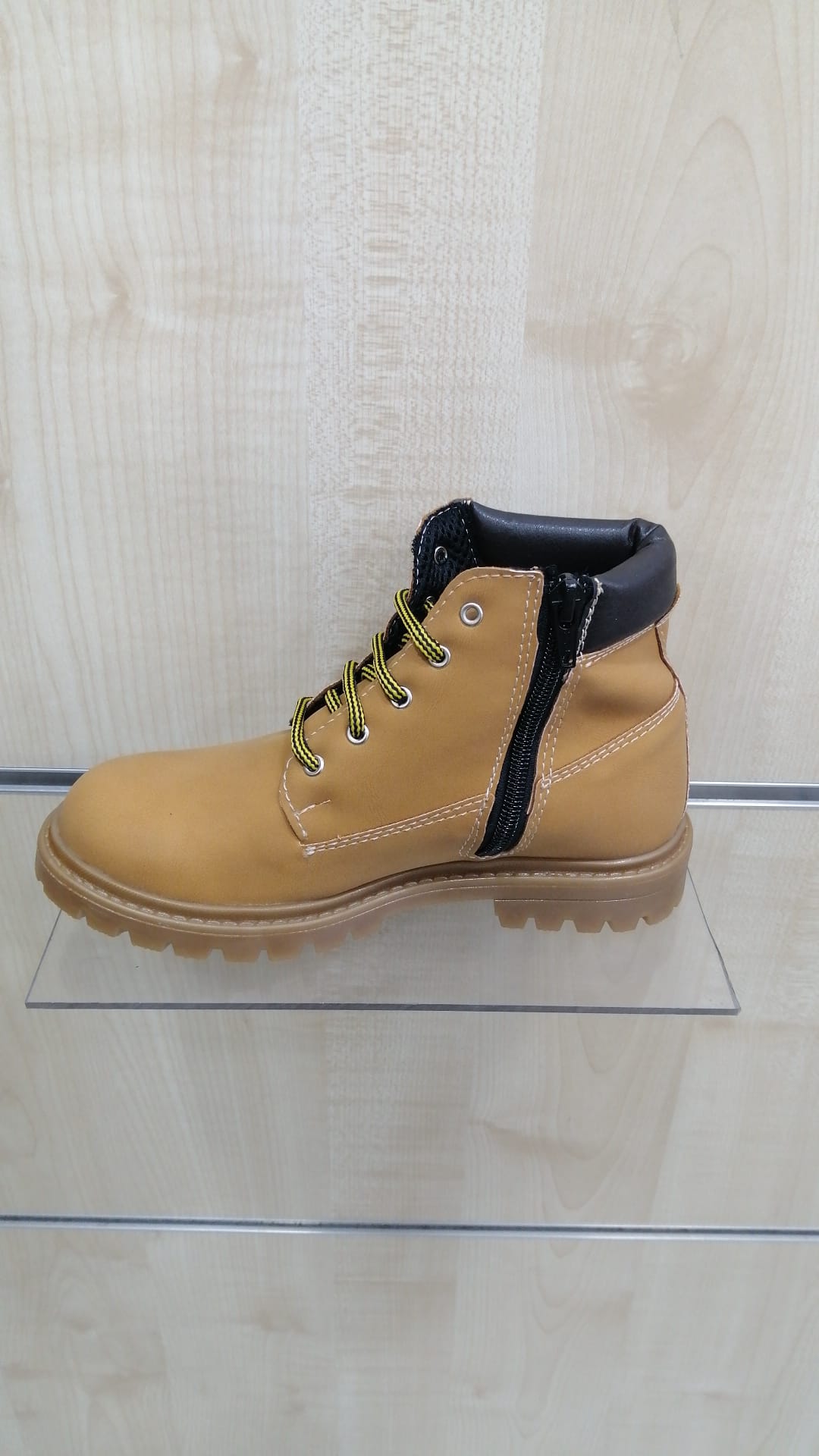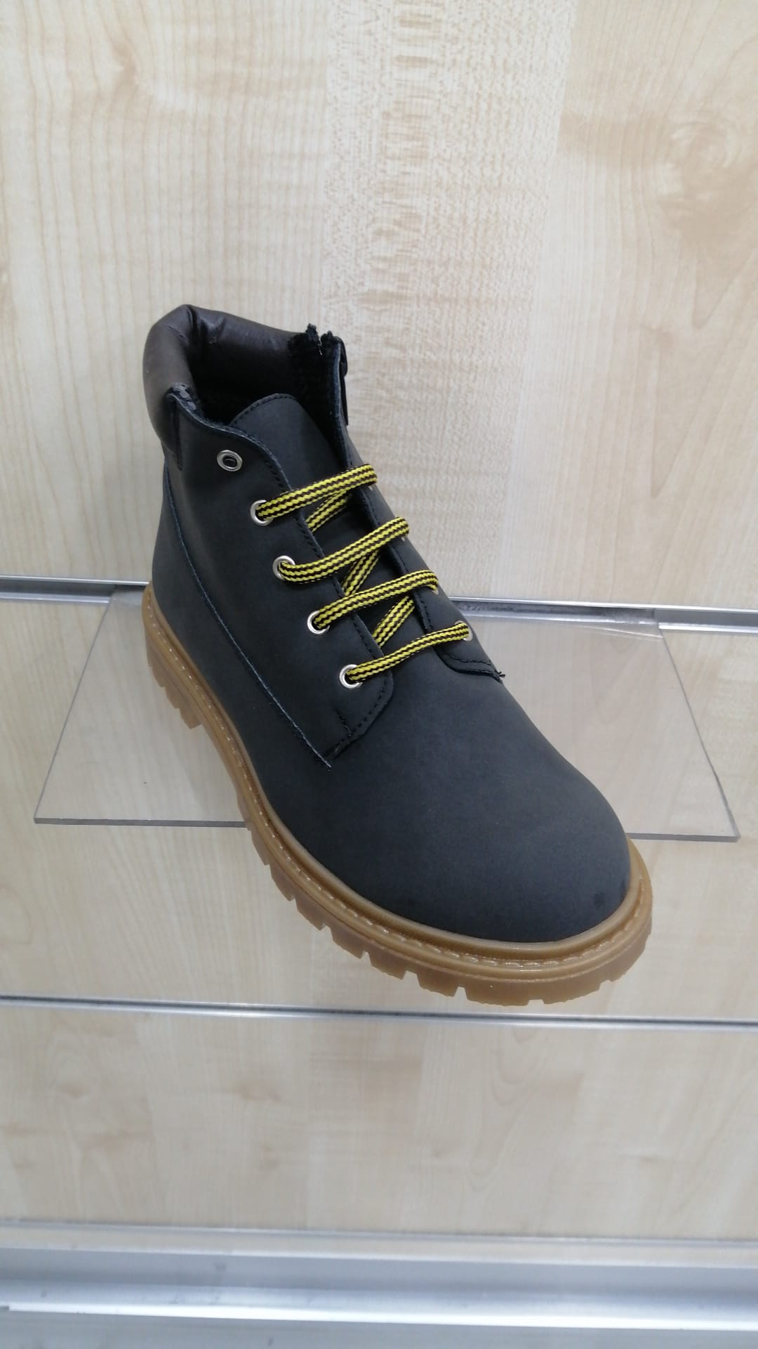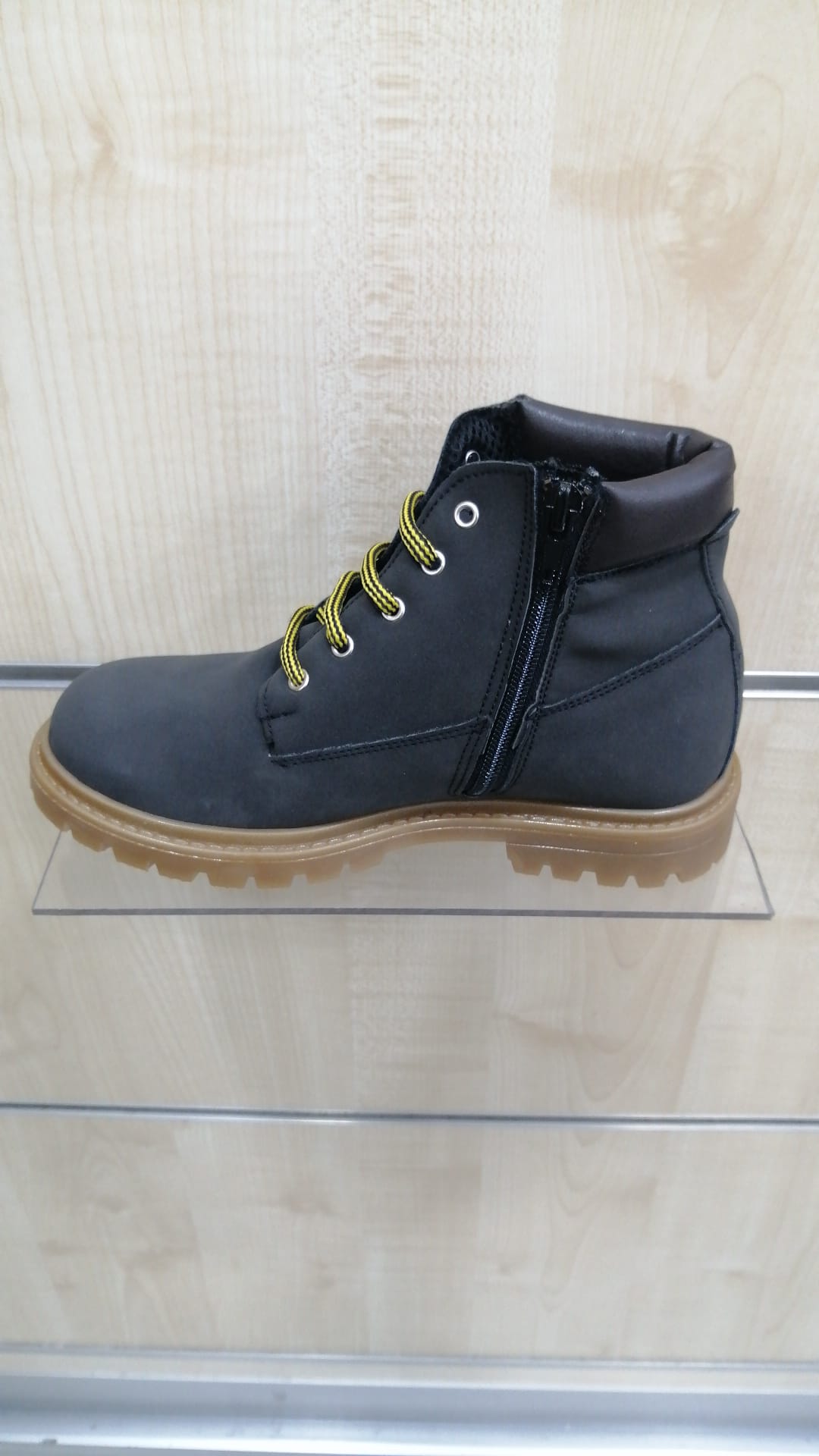 Scarponcino bimbo produzione Italiana. Polacchino per bambini con tomaia in econubuk colore giallo ocra oppure grigio topo con allacciatura e cerniera laterale per una ottima calzabilità . Il fondo è in gomma antiscivolo e flessibile.