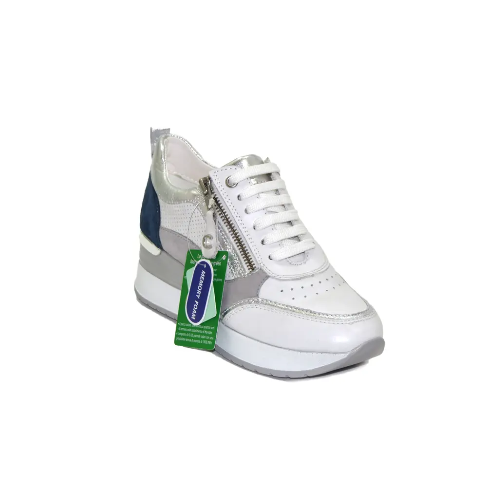Sneakers zeppa alta Cinzia soft, ortopediche a pianta larga con allacciatura e cerniera laterale. Tomaia in pelle fiore microforate morbidissime in colore bianco, con innesti di nubuk blù. La forma larga è per piedi generosi, il fondo è uniforme con zeppa cm.5,5, sottopiede traspirante è estraibile per lasciare spazio ad eventuale plantare personale.