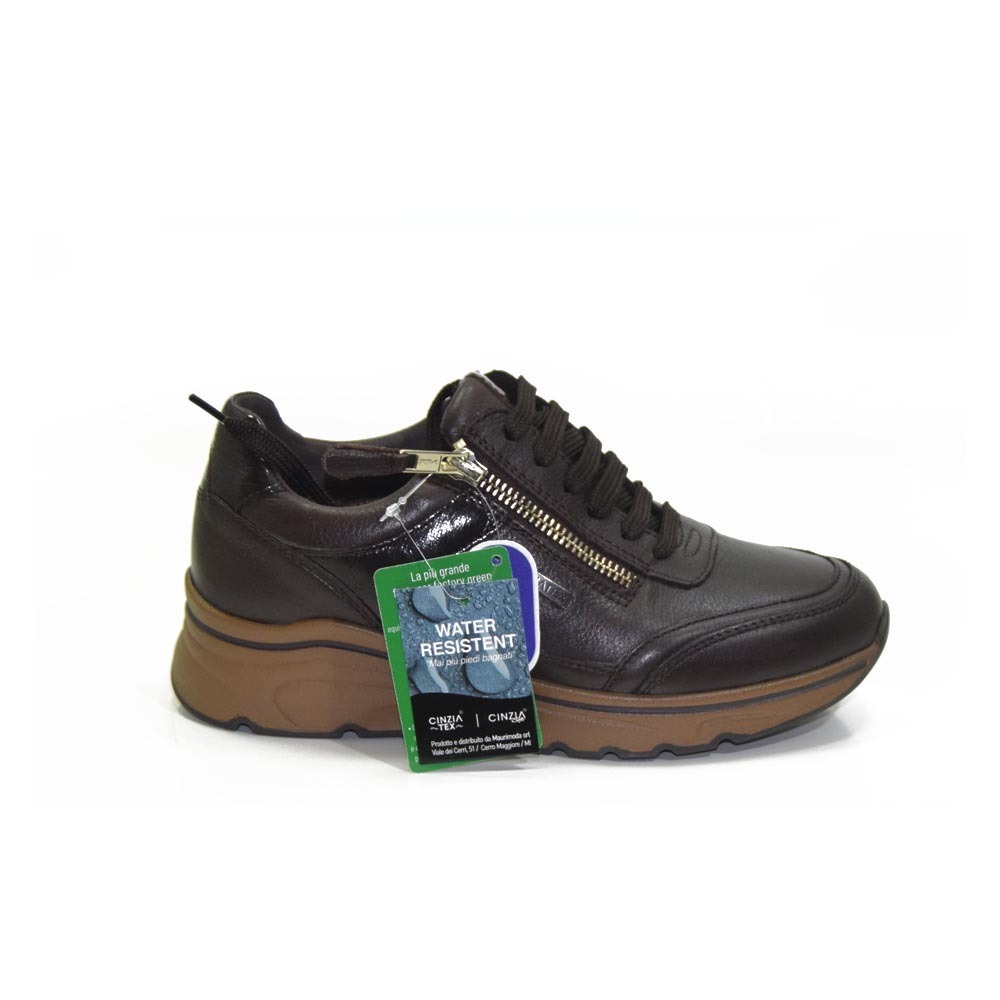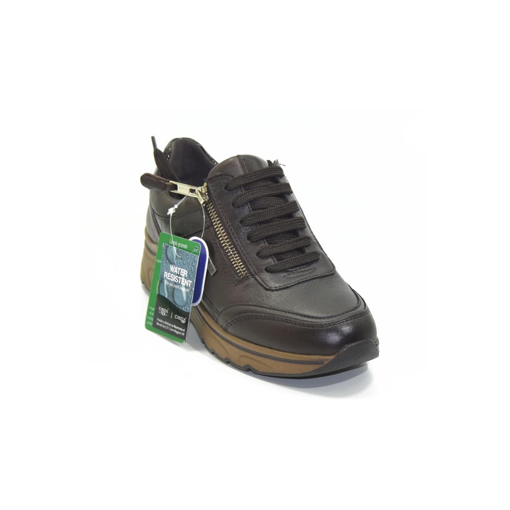 Sneakers zeppa cinzia soft, ortopediche a pianta larga con allacciatura e cerniera laterale. Tomaia in pelle fiore morbidissime in colore caffè. La forma larga è per piedi generosi, il fondo è uniforme con zeppa cm.5, sottopiede traspirante è estraibile per lasciare spazio ad eventuale plantare personale.