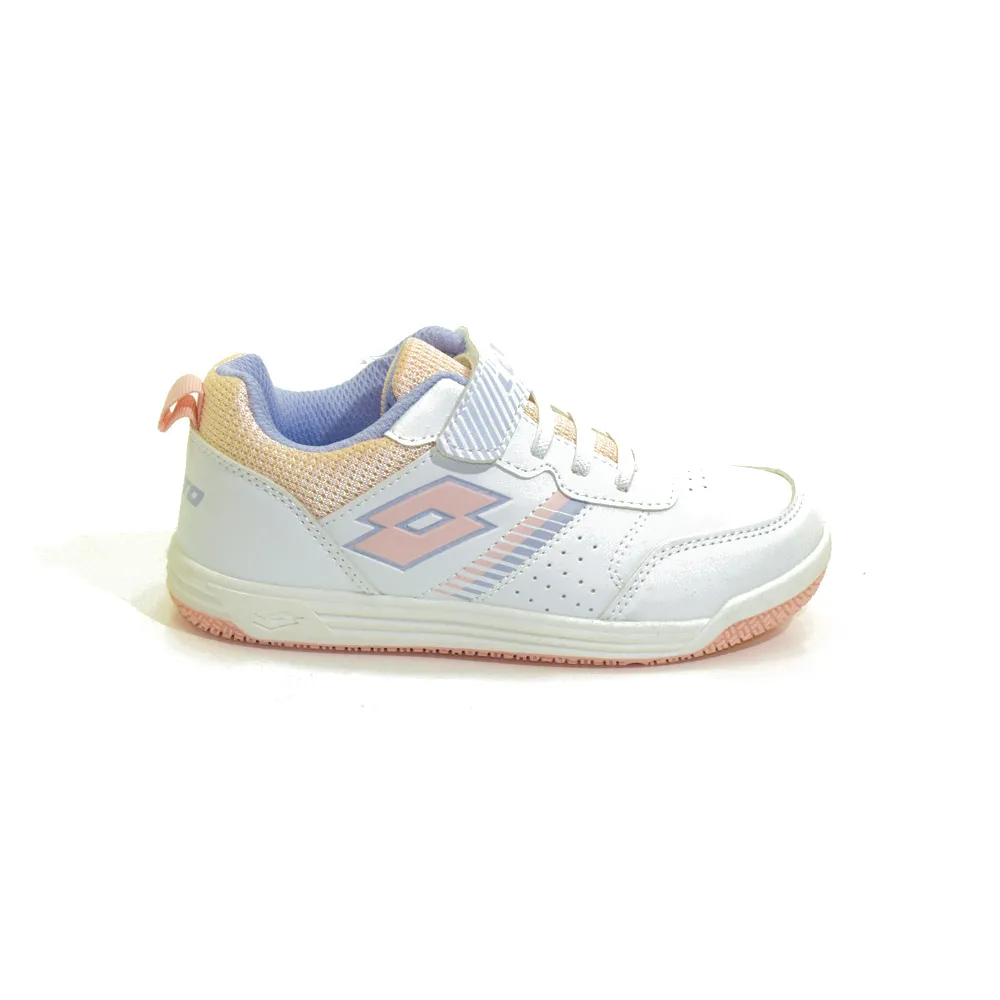Tennis Lotto strappo e elastici bimba. Tomaia in ecopelle traspirante, fondo in gomma leggera flessibile e antiscivolo. Ottima calzata anche a piedi generosi.